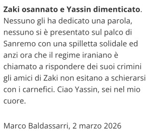 Ma oggi prova a usare il cadavere di Yasin Mirzaei per difendere chi ha ucciso 108 bambine iraniane col pretesto di voler uccidere gli ayatollah, sostenendo che bisognerebbe inventarsi un paragone fra i due casi quasi come se non ci fosse differenza tra Egitto e Iran: